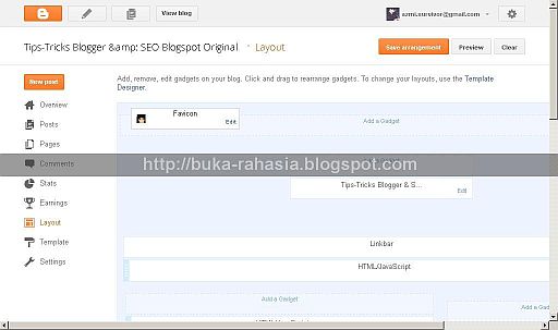 Di halaman Layout, user bisa menambah atau mengedit gadget seperti biasanya. Salah satu fitur baru di halaman tersebut adalah Blogger Custom Favicon dimana user dapat dengan mudah mengganti favicon (icon) blog. Tidak seperti dulu, dimana kita harus mengupload file .ico di hosting lain dan memasang script favicon melalui “Edit HTML”.