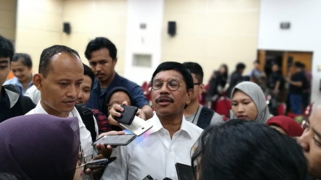 | Menkominfo Johnny Plate berbicara tentang Sumpah Pemuda di Jakarta, Senin (28/10/2019). [Suara.com/Tivan Rahmat] |
